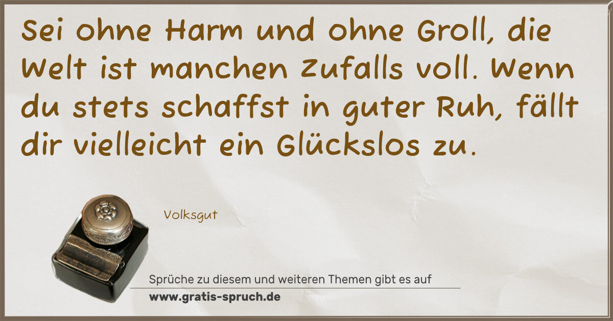 Sei ohne Harm und ohne Groll, die Welt ist manchen Zufalls voll. Wenn du stets schaffst in guter Ruh, fällt dir vielleicht ein Glückslos zu.
