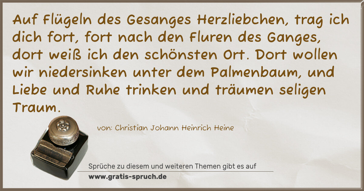 Auf Flügeln des Gesanges Herzliebchen, trag ich dich fort, fort nach den Fluren des Ganges, dort weiß ich den schönsten Ort. Dort wollen wir niedersinken unter dem Palmenbaum, und Liebe und Ruhe trinken und träumen seligen Traum.