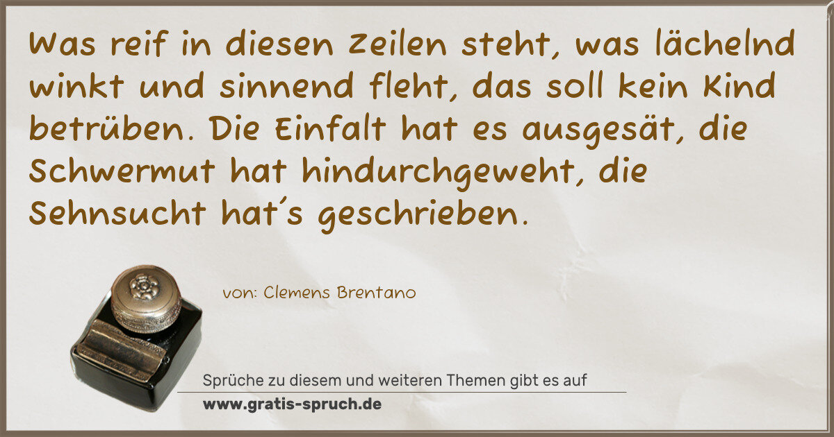 Was reif in diesen Zeilen steht, was lächelnd winkt und sinnend fleht, das soll kein Kind betrüben. Die Einfalt hat es ausgesät, die Schwermut hat hindurchgeweht, die Sehnsucht hat's geschrieben.