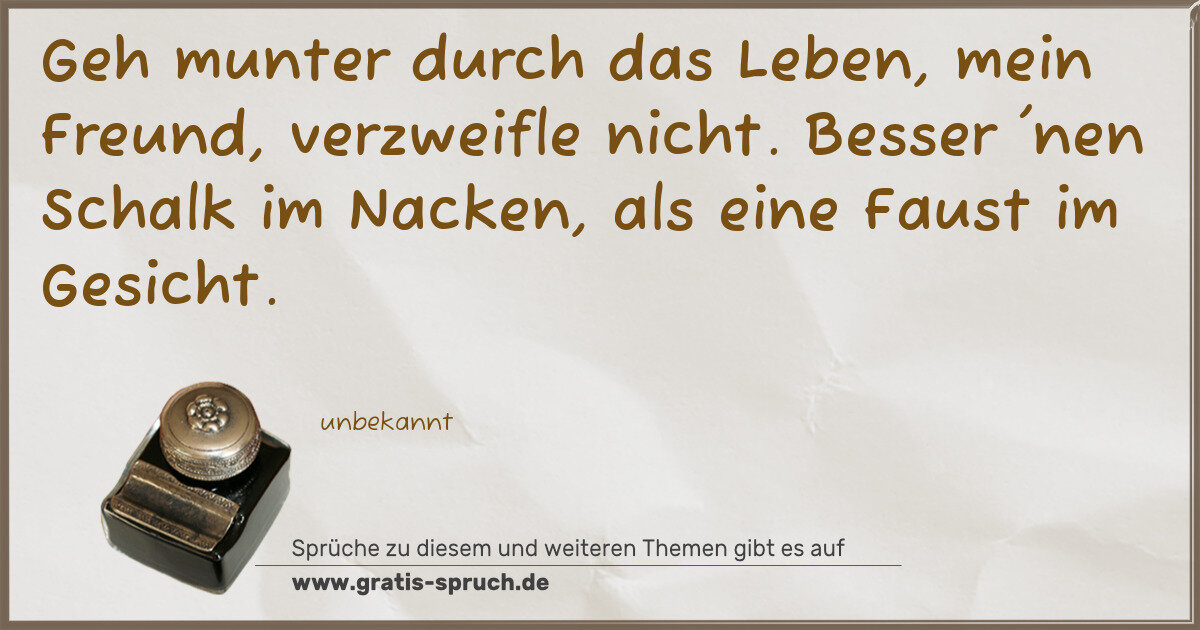 Geh munter durch das Leben, mein Freund, verzweifle nicht. Besser 'nen Schalk im Nacken, als eine Faust im Gesicht.