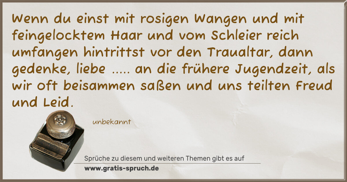 Wenn du einst mit rosigen Wangen und mit feingelocktem Haar und vom Schleier reich umfangen hintrittst vor den Traualtar, dann gedenke, liebe ..... an die frühere Jugendzeit, als wir oft beisammen saßen und uns teilten Freud und Leid.