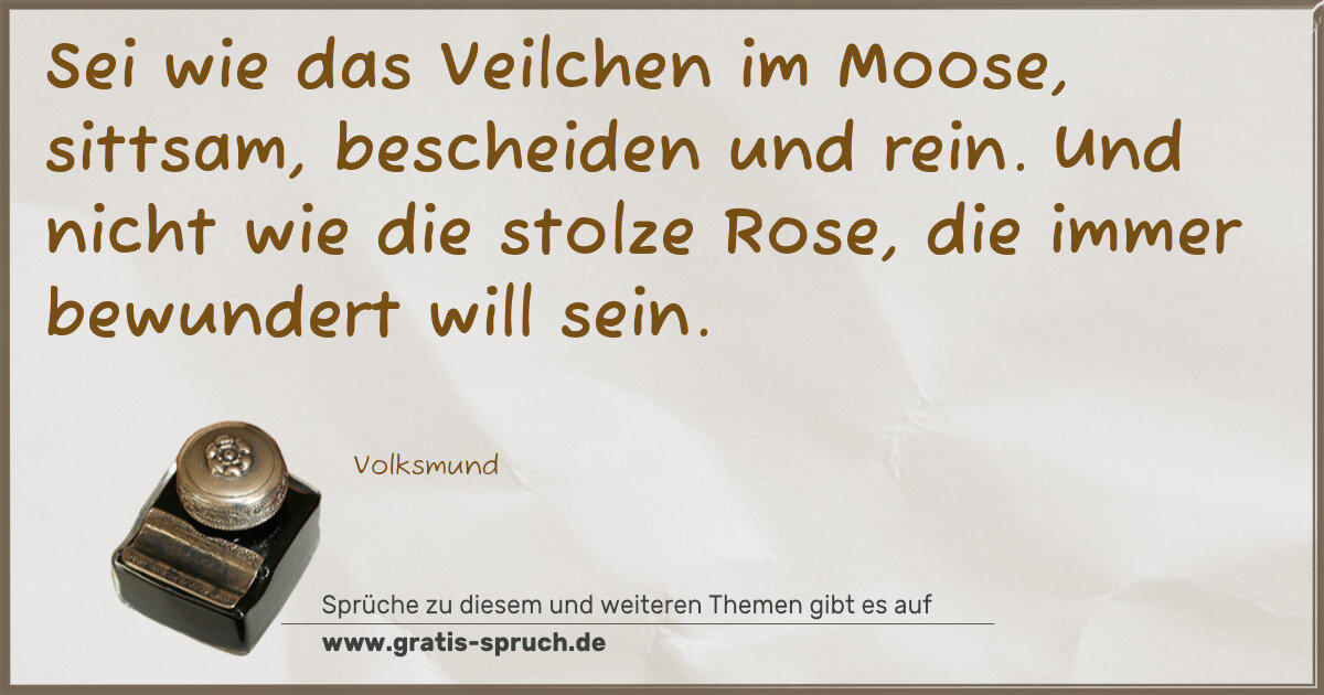 ❝Sei wie das Veilchen im Moose, sittsam, bescheiden und rein. Und nicht wie die stolze Rose, die immer bewundert will sein.ThemenLebenGlückDankbarkeitWeitere Leben Sprüche →Ähnliche SprücheLiebe ist in dem, der liebt, nicht in dem, der geliebt wird.— PlatonHast du einen Menschen gern, musst du ihn verstehen und nicht hier und da und dort nur nach seinen Fehlern sehen. Scha …Das höchste Glück des Lebens besteht in der Überzeugung, geliebt zu werden.— Victor-Marie Hugo