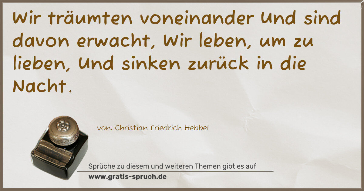 Wir träumten voneinander Und sind davon erwacht, Wir leben, um zu lieben, Und sinken zurück in die Nacht.