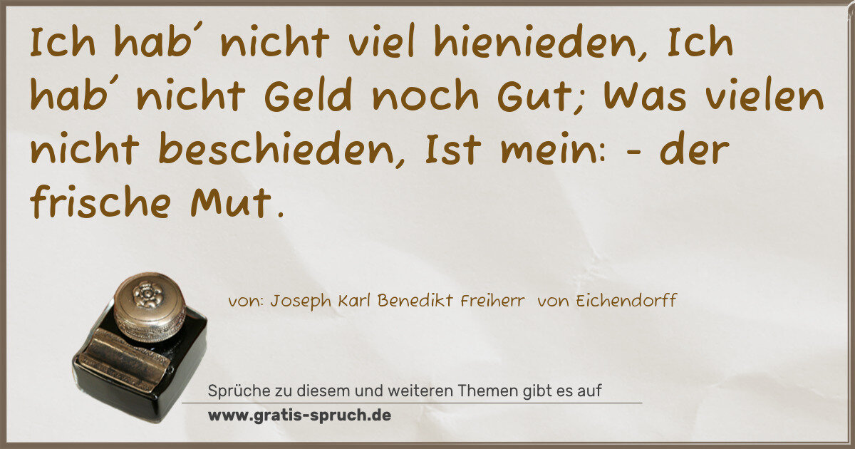 Ich hab' nicht viel hienieden, Ich hab' nicht Geld noch Gut; Was vielen nicht beschieden, Ist mein: - der frische Mut.