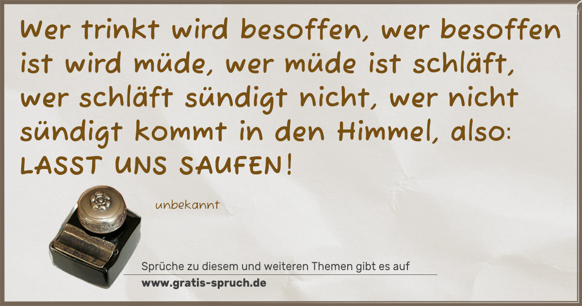 Wer trinkt wird besoffen, wer besoffen ist wird müde, wer müde ist schläft, wer schläft sündigt nicht, wer nicht sündigt kommt in den Himmel, also: LASST UNS SAUFEN!