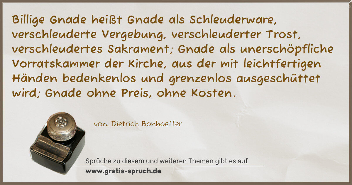 Billige Gnade heißt Gnade als Schleuderware, verschleuderte Vergebung, verschleuderter Trost, verschleudertes Sakrament; Gnade als unerschöpfliche Vorratskammer der Kirche, aus der mit leichtfertigen Händen bedenkenlos und grenzenlos ausgeschüttet wird; Gnade ohne Preis, ohne Kosten.