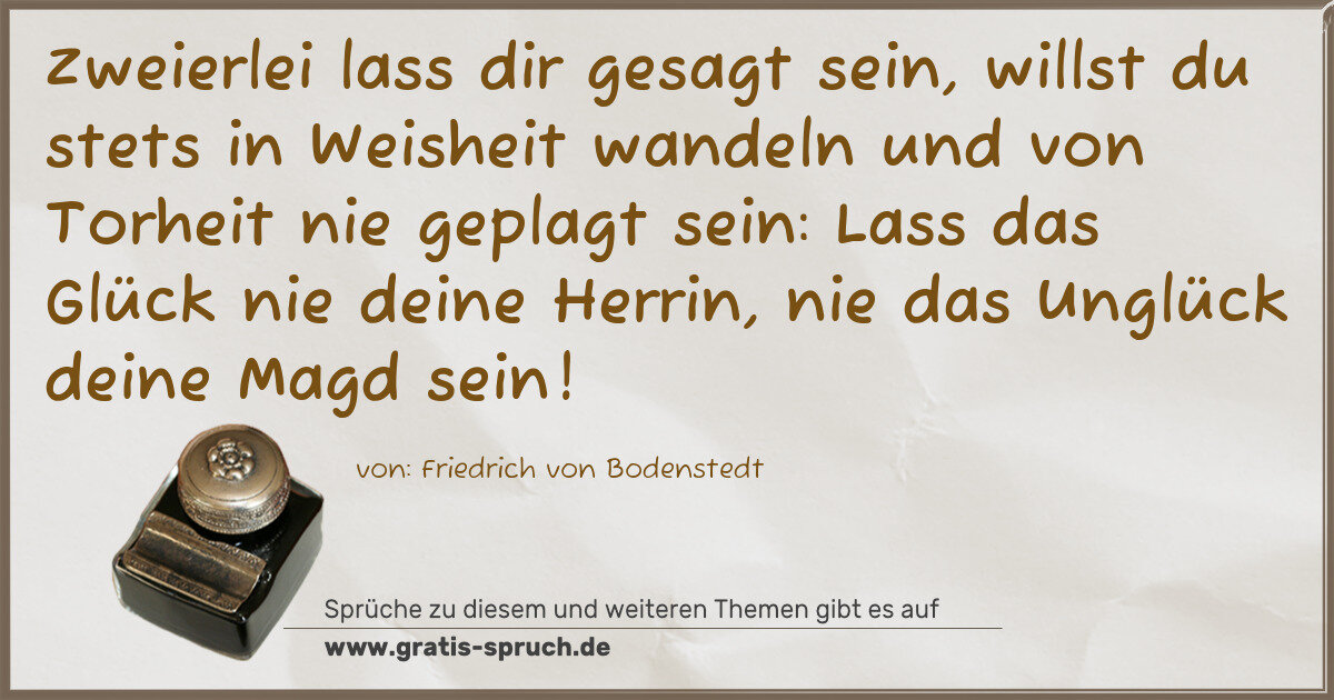 Zweierlei lass dir gesagt sein, willst du stets in Weisheit wandeln und von Torheit nie geplagt sein: Lass das Glück nie deine Herrin, nie das Unglück deine Magd sein!