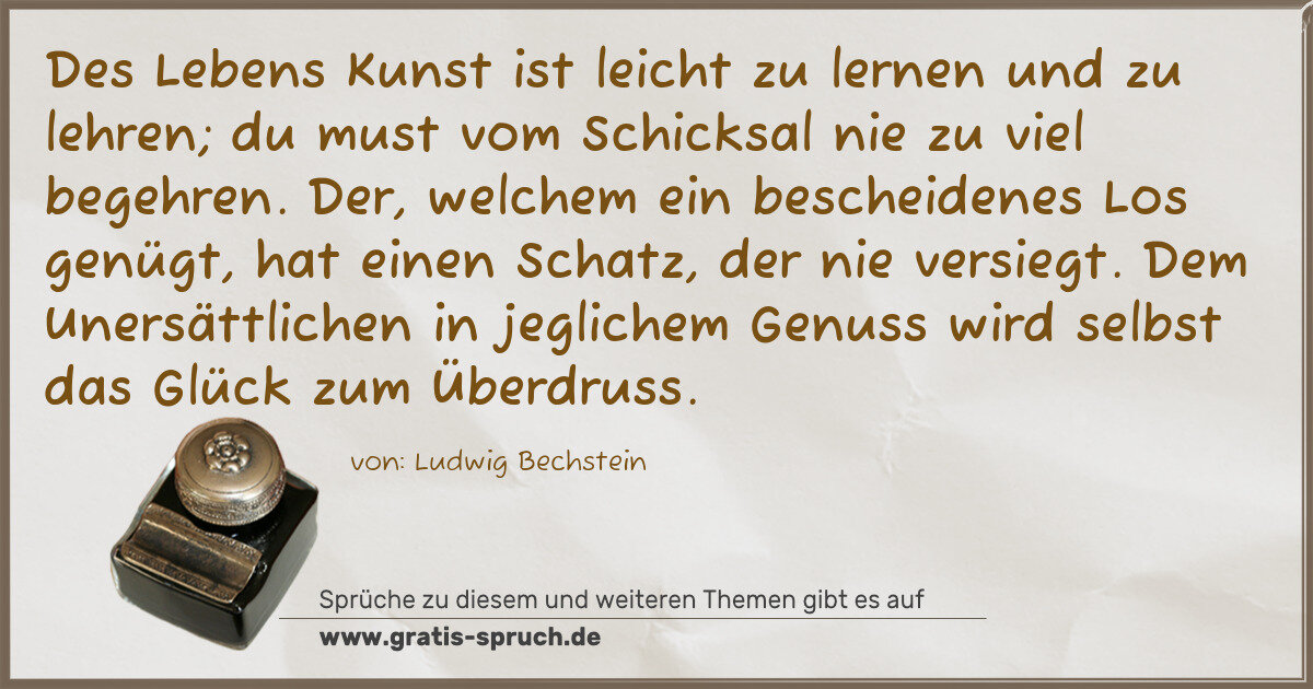 Des Lebens Kunst ist leicht zu lernen und zu lehren; du must vom Schicksal nie zu viel begehren. Der, welchem ein bescheidenes Los genügt, hat einen Schatz, der nie versiegt. Dem Unersättlichen in jeglichem Genuss wird selbst das Glück zum Überdruss.
