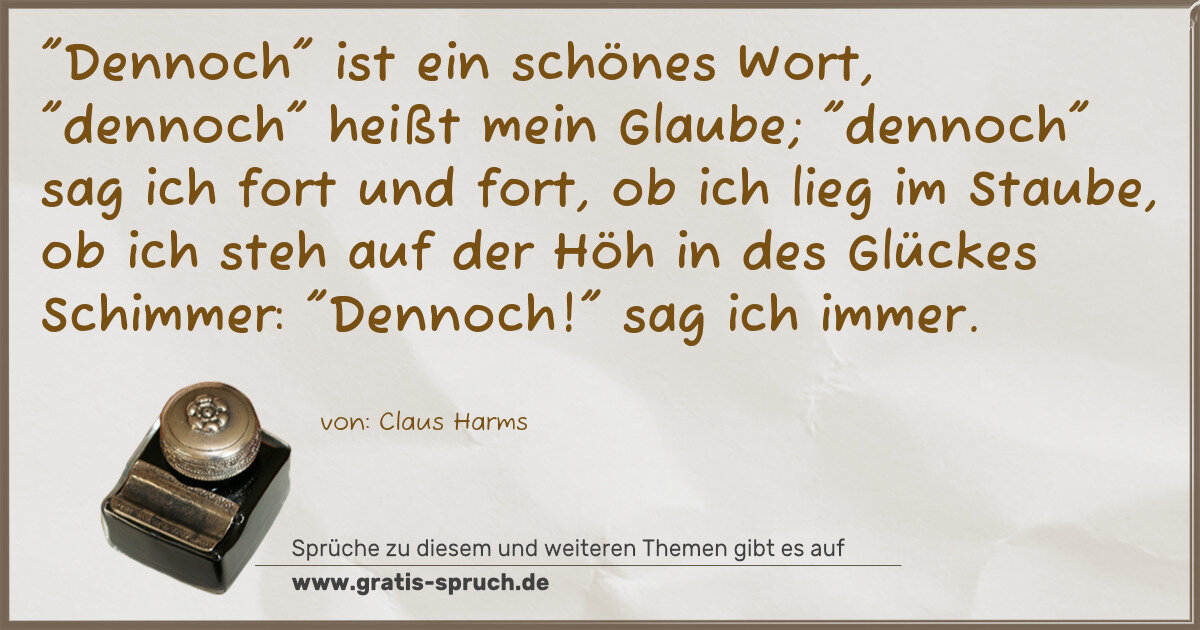 "Dennoch" ist ein schönes Wort, "dennoch" heißt mein Glaube; "dennoch" sag ich fort und fort, ob ich lieg im Staube, ob ich steh auf der Höh in des Glückes Schimmer: "Dennoch!" sag ich immer.