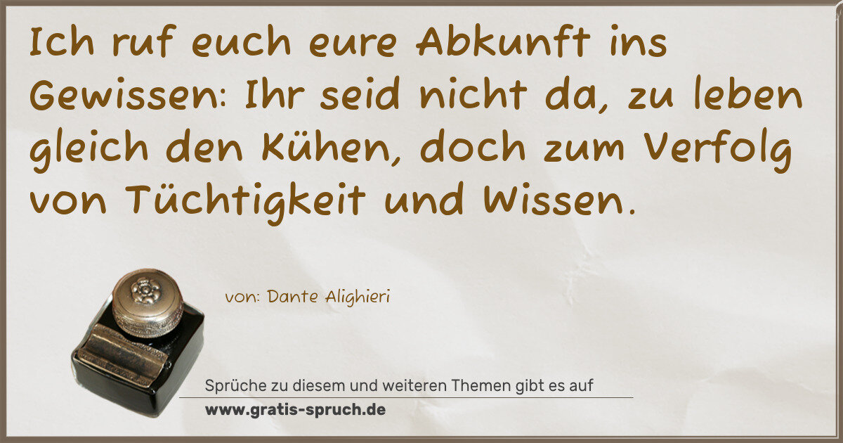 Ich ruf euch eure Abkunft ins Gewissen: Ihr seid nicht da, zu leben gleich den Kühen, doch zum Verfolg von Tüchtigkeit und Wissen.