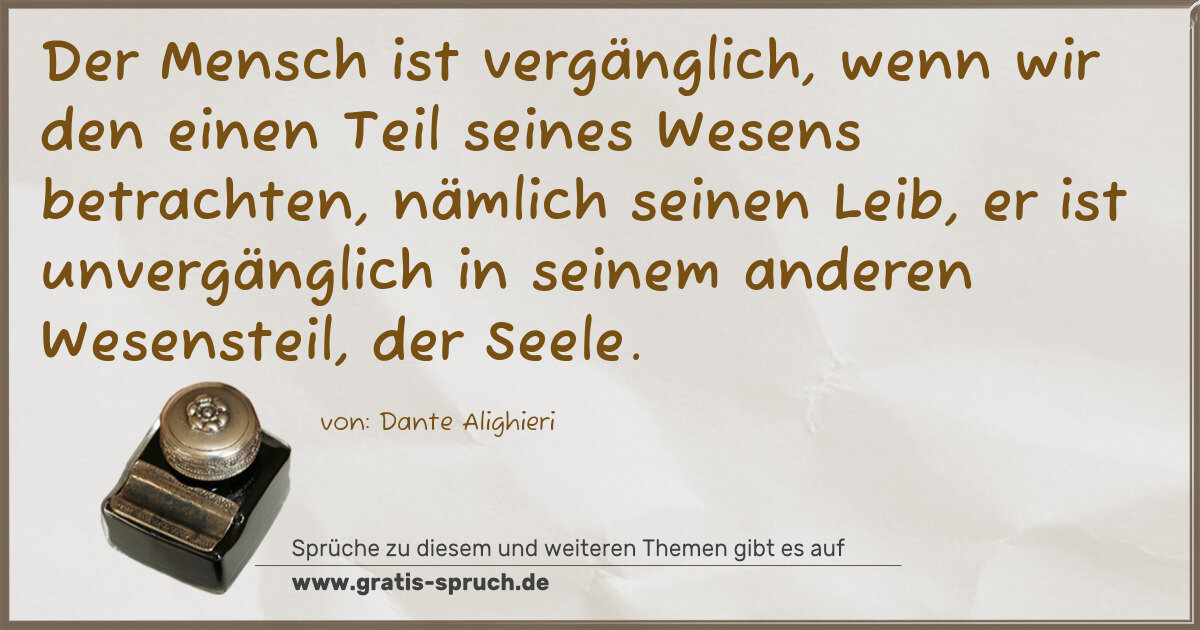 Der Mensch ist vergänglich, wenn wir den einen Teil seines Wesens betrachten, nämlich seinen Leib, er ist unvergänglich in seinem anderen Wesensteil, der Seele.