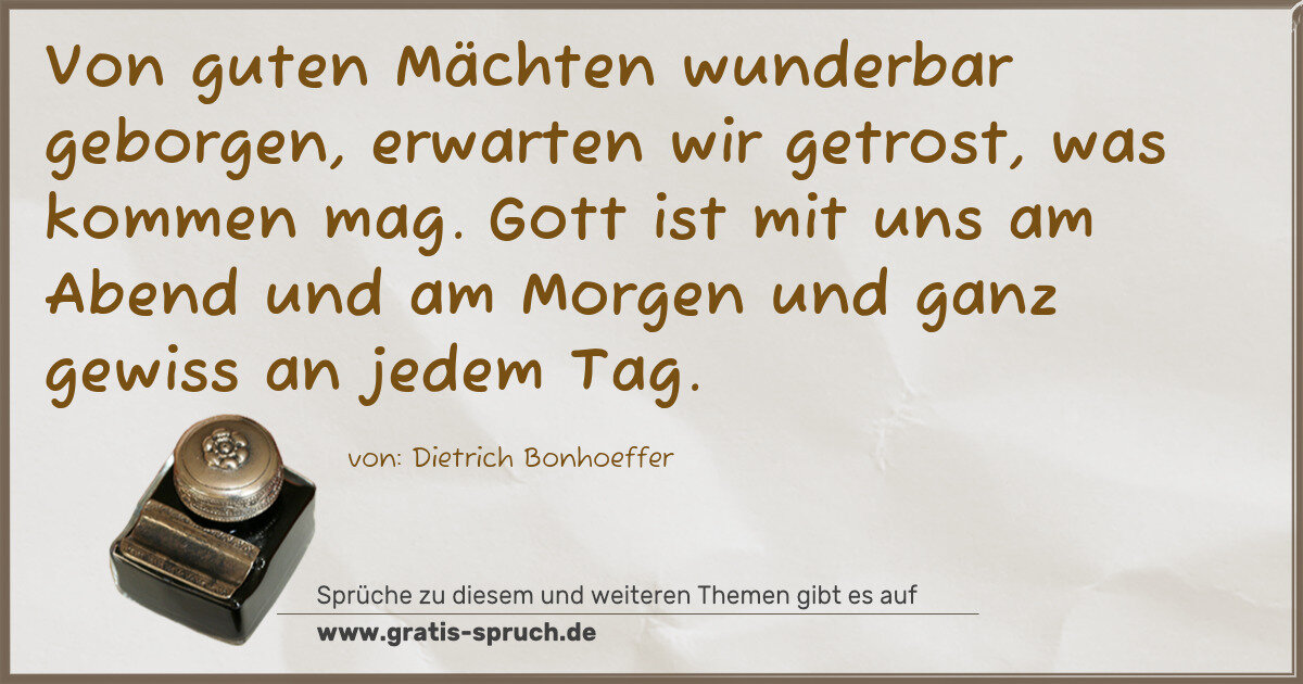 Von guten Mächten wunderbar geborgen, erwarten wir getrost, was kommen mag. Gott ist mit uns am Abend und am Morgen und ganz gewiss an jedem Tag.