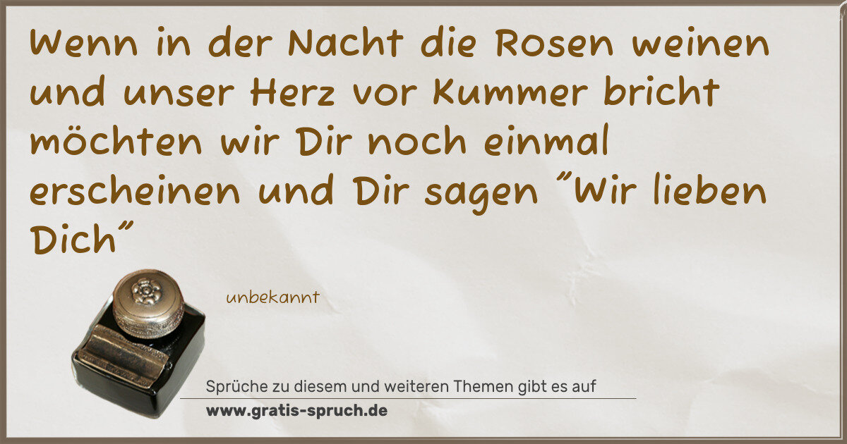 Wenn in der Nacht die Rosen weinen und unser Herz vor Kummer bricht möchten wir Dir noch einmal erscheinen und Dir sagen "Wir lieben Dich"