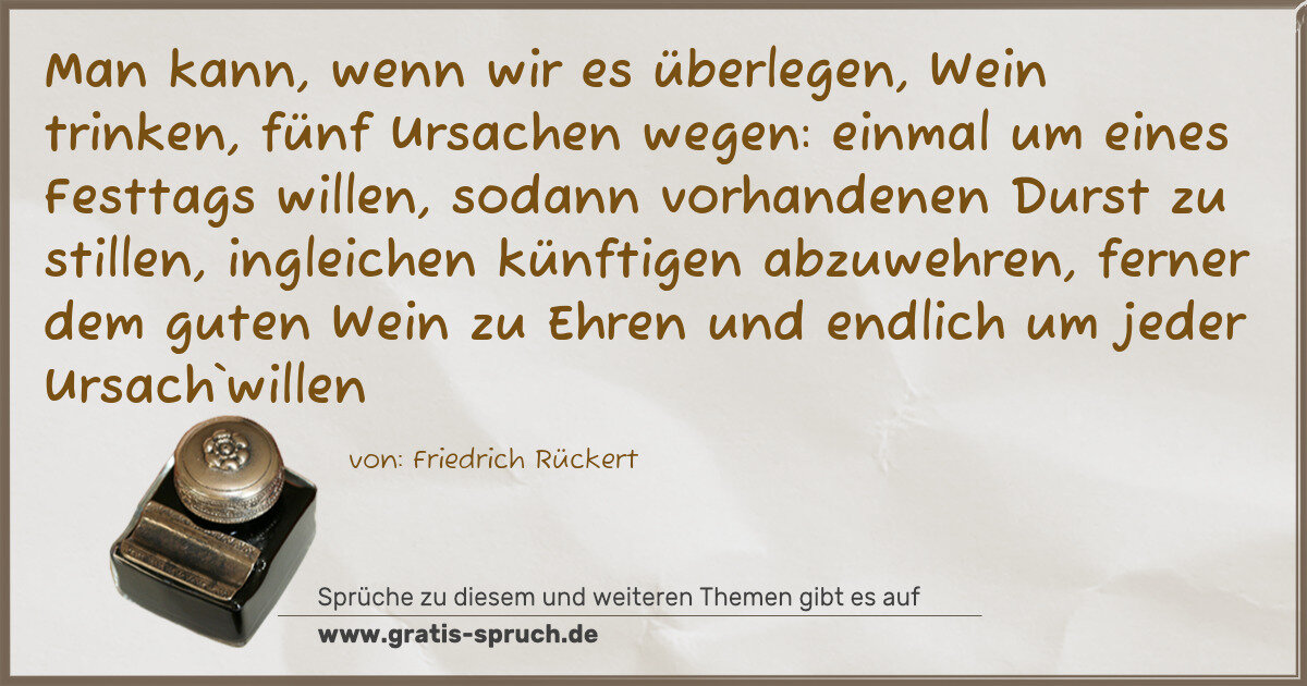 Man kann, wenn wir es überlegen, Wein trinken, fünf Ursachen wegen: einmal um eines Festtags willen, sodann vorhandenen Durst zu stillen, ingleichen künftigen abzuwehren, ferner dem guten Wein zu Ehren und endlich um jeder Ursach`willen