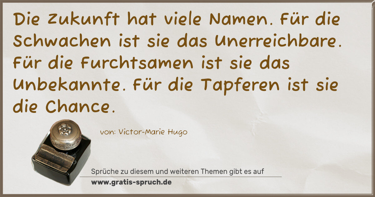 Die Zukunft hat viele Namen. Für die Schwachen ist sie das Unerreichbare. Für die Furchtsamen ist sie das Unbekannte. Für die Tapferen ist sie die Chance.