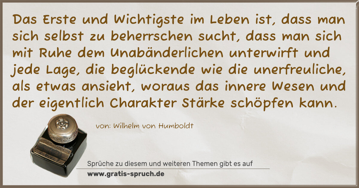 Das Erste und Wichtigste im Leben ist, dass man sich selbst zu beherrschen sucht, dass man sich mit Ruhe dem Unabänderlichen unterwirft und jede Lage, die beglückende wie die unerfreuliche, als etwas ansieht, woraus das innere Wesen und der eigentlich Charakter Stärke schöpfen kann.