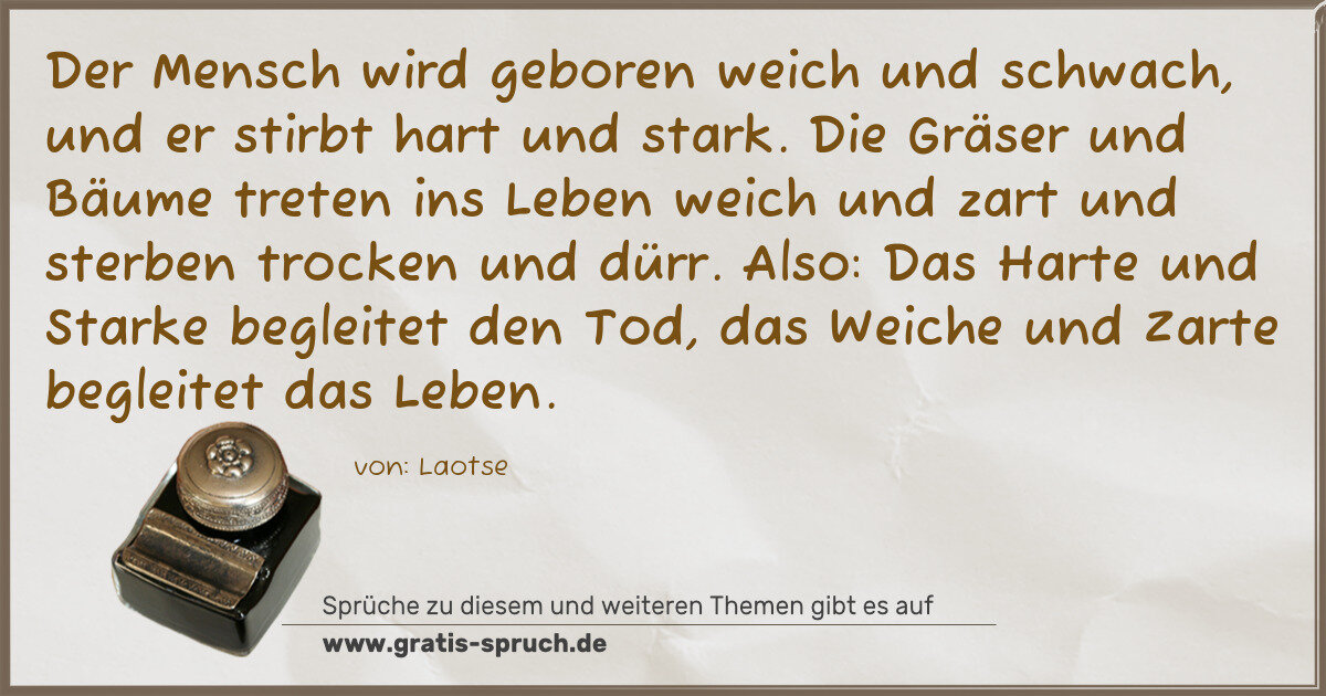 Der Mensch wird geboren weich und schwach, und er stirbt hart und stark. Die Gräser und Bäume treten ins Leben weich und zart und sterben trocken und dürr. Also: Das Harte und Starke begleitet den Tod, das Weiche und Zarte begleitet das Leben.