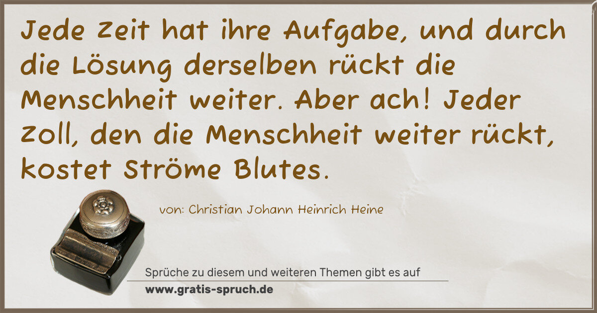 Jede Zeit hat ihre Aufgabe, und durch die Lösung derselben rückt die Menschheit weiter. Aber ach! Jeder Zoll, den die Menschheit weiter rückt, kostet Ströme Blutes.