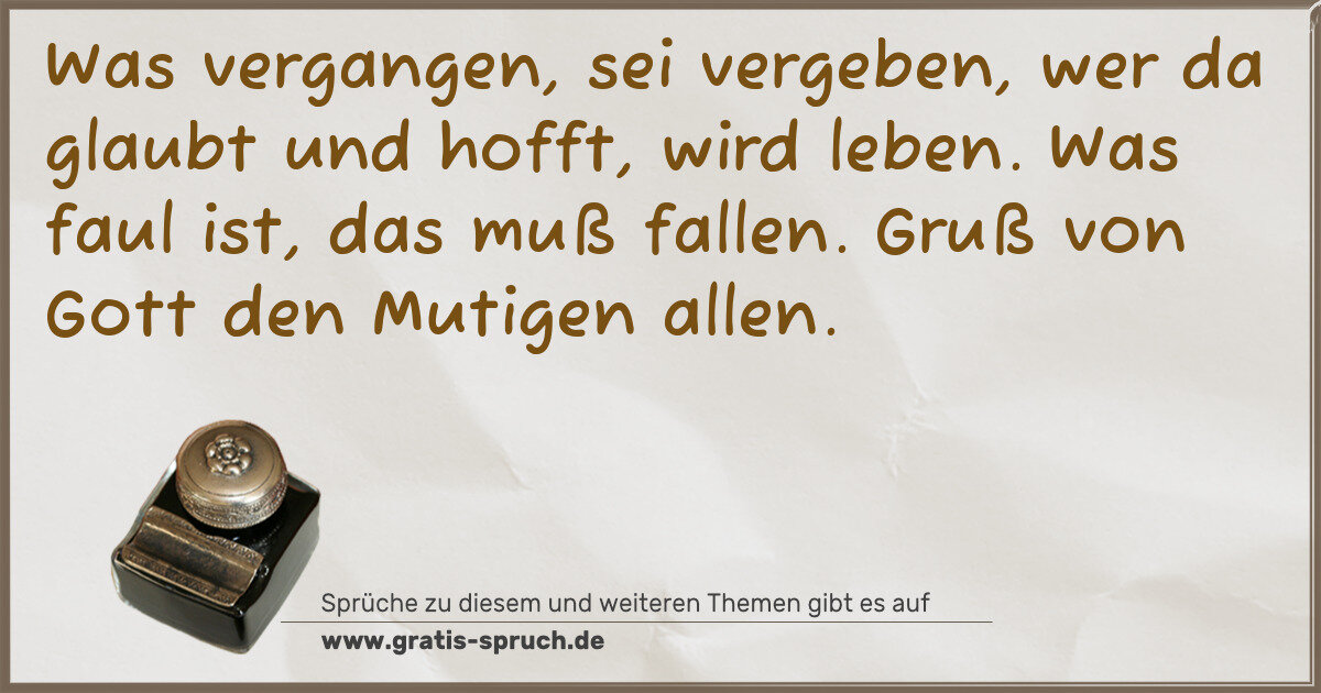 Was vergangen, sei vergeben, wer da glaubt und hofft, wird leben. Was faul ist, das muß fallen. Gruß von Gott den Mutigen allen.