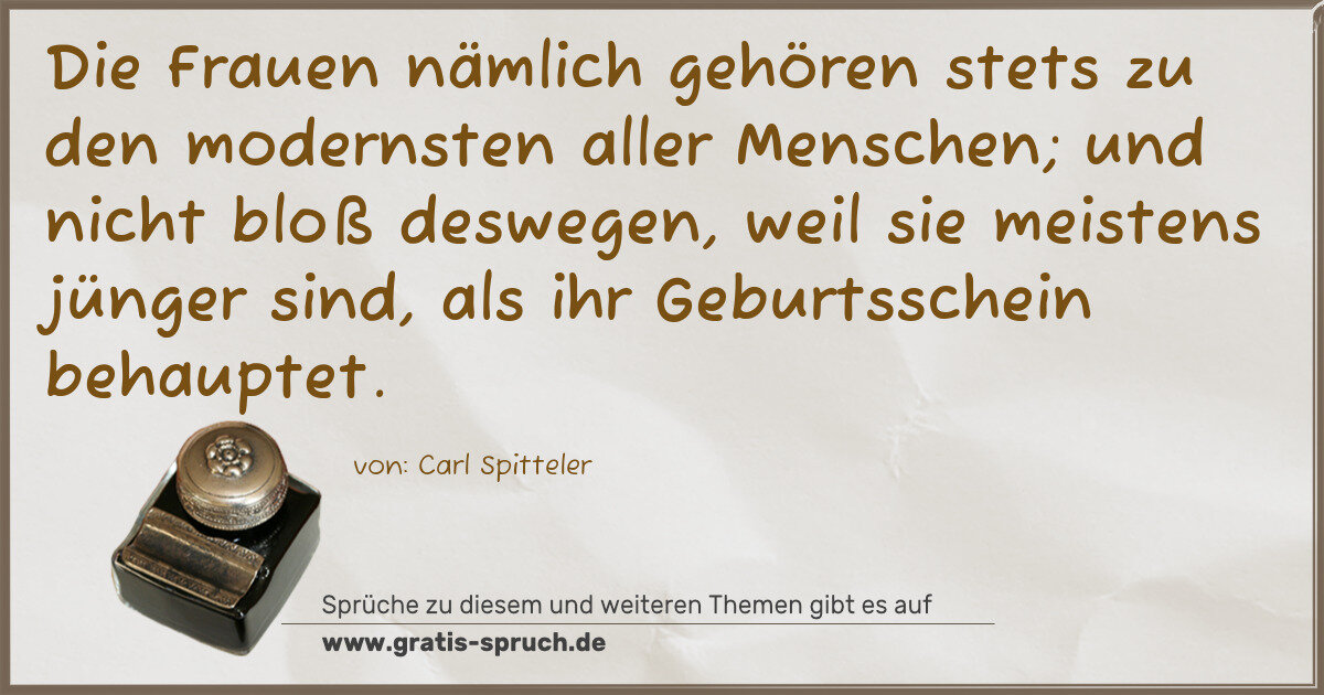 Die Frauen nämlich gehören stets zu den modernsten aller Menschen; und nicht bloß deswegen, weil sie meistens jünger sind, als ihr Geburtsschein behauptet.