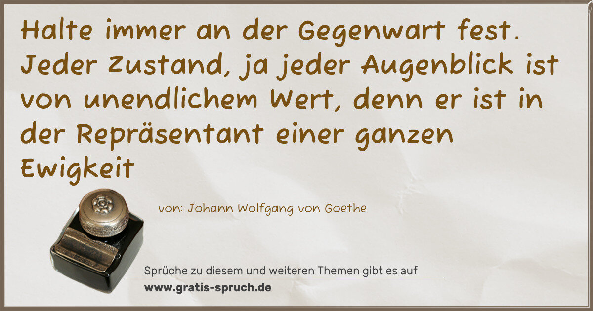 Halte immer an der Gegenwart fest. Jeder Zustand, ja jeder Augenblick ist von unendlichem Wert, denn er ist in der Repräsentant einer ganzen Ewigkeit